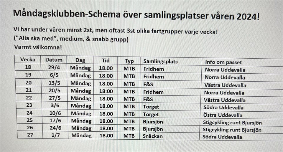 Hej! Vi påminner er igen om att Måndagsklubben har nu i vår/sommar olika samlingsplatser som vi utgår ifrån! Nu på Måndagen den 20/5 samlas vi på Fridhem. För samlingsplats övriga Måndagar framöver, se bifogat schema! (Ni kan även se denna informationen i vår kalender på Laget.se) Vi har varje vecka beroende på deltagarantalet, mm 2-3 st grupper med olika hastigheter. Varmt välkomna! Med vänlig hälsning/ UddevallaCK UddevallaCK kalender