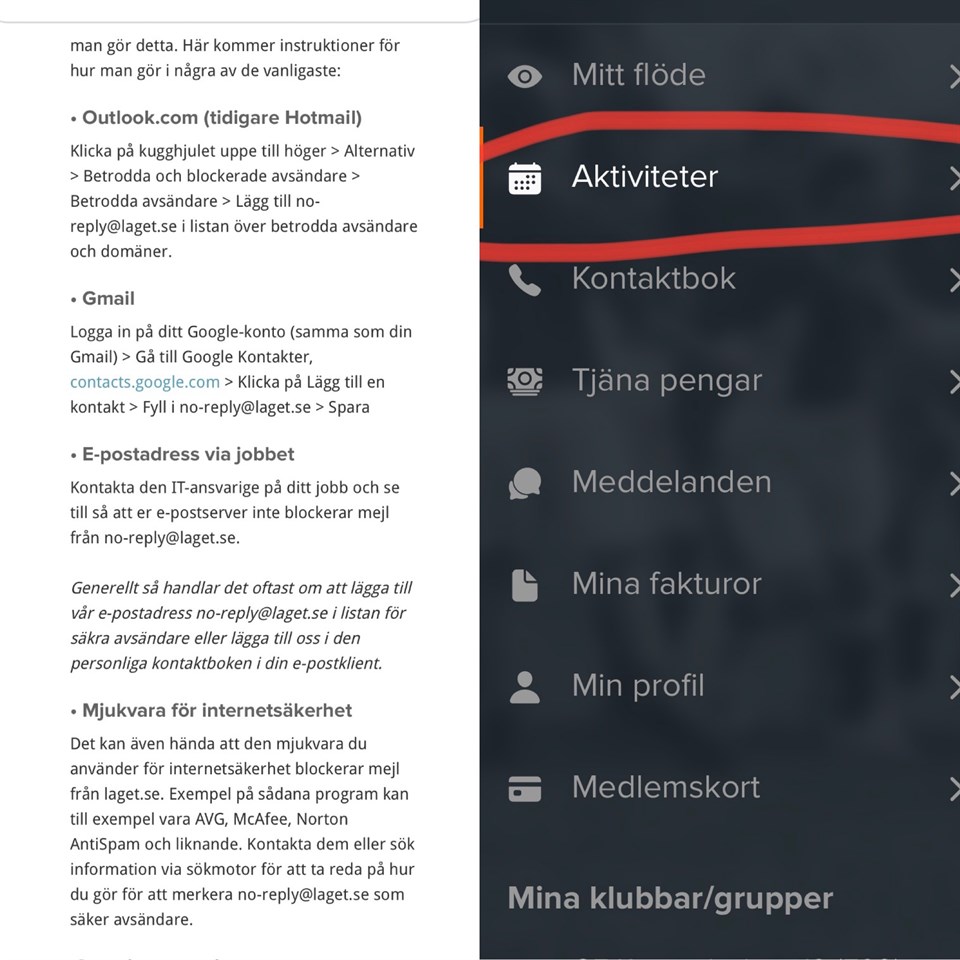 Hej! Det har nu skickats ut en kallelse inför onsdagens träning på Kasen till alla ungdomar som är registrerade i en grupp. Vänligen svara på denna kallelse så vi vet hur många som kommer på onsdagens träning. Kallelsen skicks ut via mail, men syns även under ”Aktiviteter” i Appen. (Se bifogad bild) OBS! Om ni INTE fått någon kallelse till er via den mailadress ni tidigare har uppgett, vänligen kolla då i er skräppost i er mail! Om kallelsen har hamnat där, flytta då denna till er vanlig inkorg. Skulle kallelser och nyhets mail även i framtiden sen fortsätta komma till er skräppost, behöver ni själva isf gå in och ”godkänna” denna mailadress, (no-reply@laget.se) i er egen mail. Tillvägagångssätt för detta finner ni i bifogad bild. Med vänlig hälsning/ Ledarna.